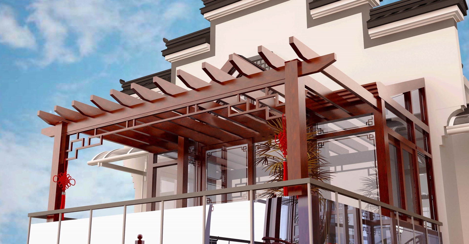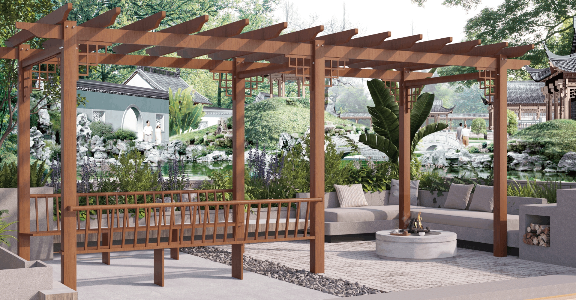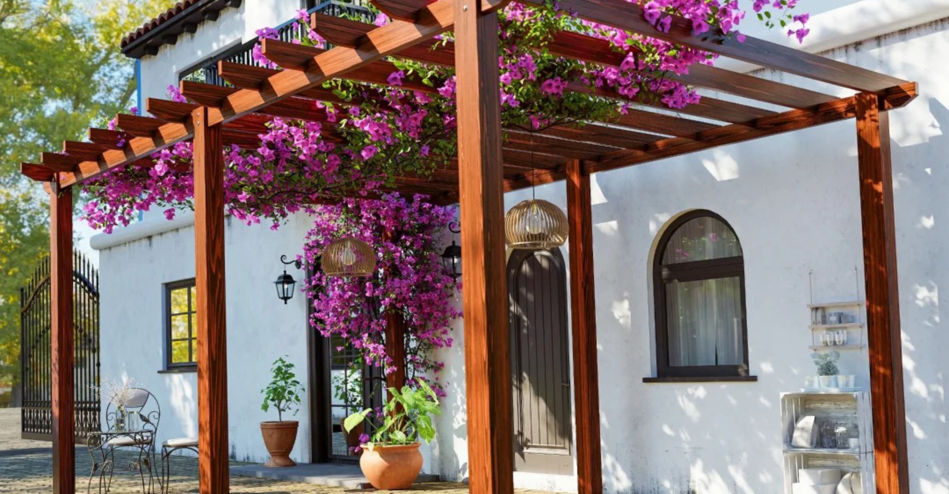 在家庭庭院中,葡萄架与绿植结合,营造静谧惬意的休闲空间,可用于乘凉、观景、赏月等。